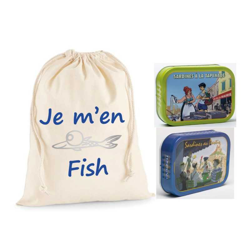 Colis avec 2 jolies et délicieuses boites de Sardines livrées dans un sac en tissu réutilisable.